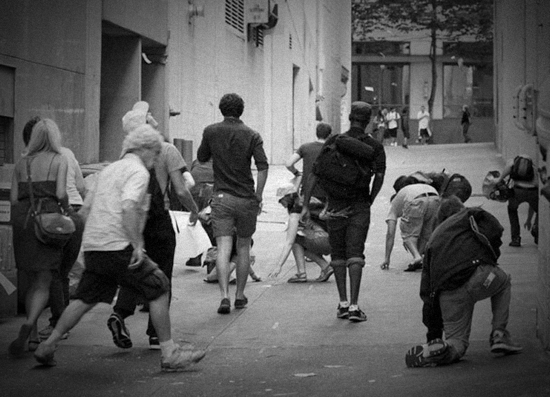 la frénésie des gens ne se fit pas attendre : ils se jetèrent tous sur les billets tombés du ciel comme nous aurions tous du tomber sur Bernard Madoff à la sortie de son audience.­