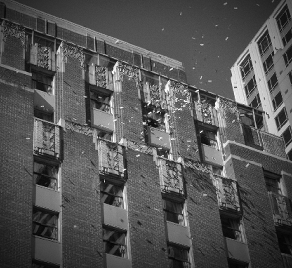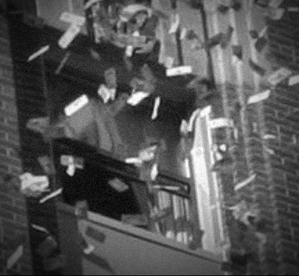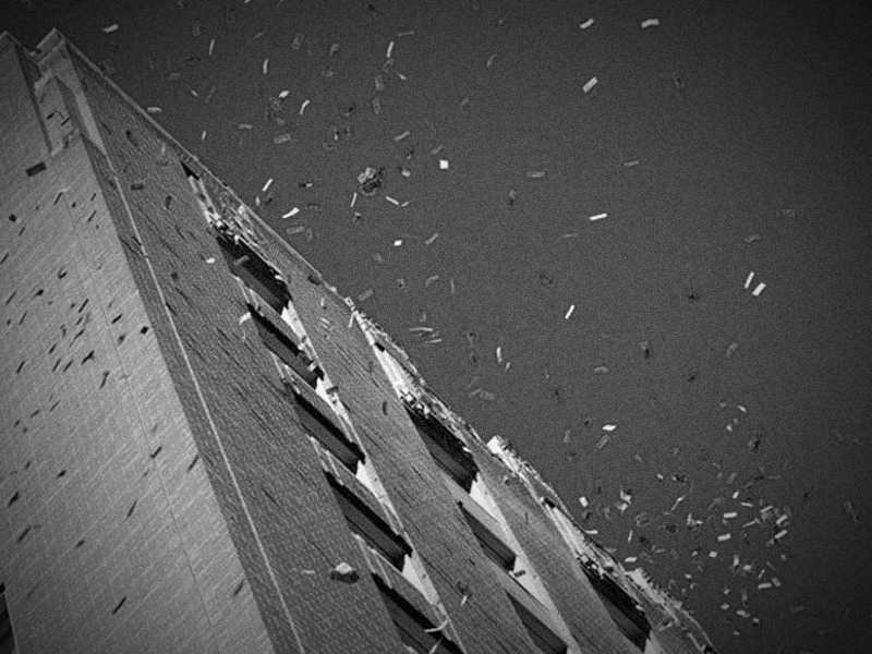 Madoff out of he window Project – Réalisation de 10 000 billets de 1 dollar à l’effigie de Bernard Madoff lancés du haut d’un immeuble près du siège de la District Court du sud de Manhattan – Impression numérique – New York – 2009