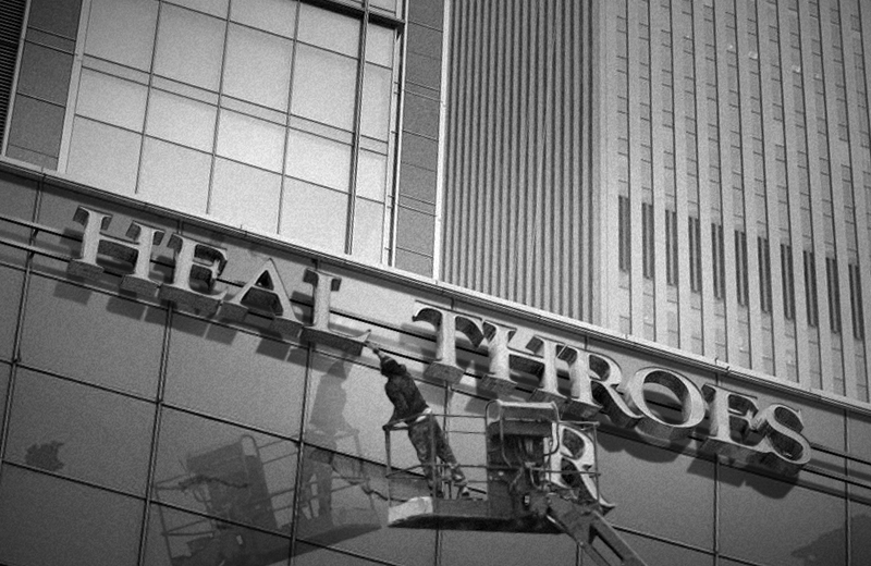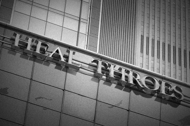 Pour Lehman Brothers, nous savions que les derniers biens, matériel et œuvres d’Art allait être vendus aux enchères chez Sotheby’s et Christie’s. Nous guettions le démantèlement de l’enseigne principale et lorsque les techniciens et les nacelles arrivèrent, nous sommes tout simplement allés les voir en leur expliquant exactement le projet  : nous voulions inverser quelques lettres de l’enseigne pour y inscrire l’anagramme «Heal Throes» comme si la banque fossoyeur de notre économie pouvait encore guérir de sa propre agonie.