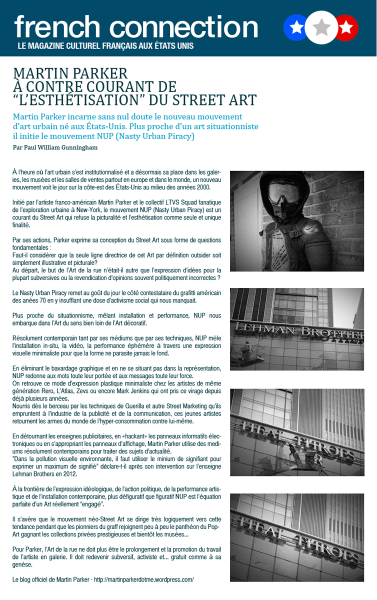 Initié par l’artiste franco-américain Martin Parker et le collectif LTVS Squad fanatique de l’exploration urbaine à New-York, le mouvement NUP (Nasty Urban Piracy) est un courant du Street Art qui refuse la picturalité et l’esthétisation comme seule et unique finalité.