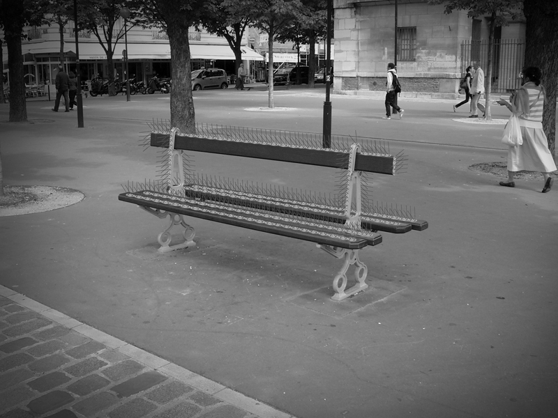 Common Places Project – Détournement de mobilier urbain – Pics anti pigeons + scotch double face – Place de la Nation – Paris – 2013