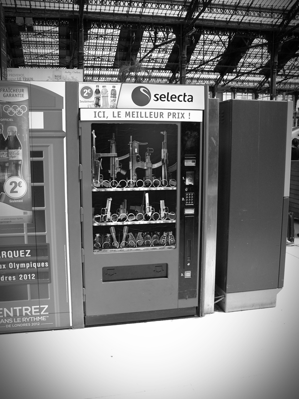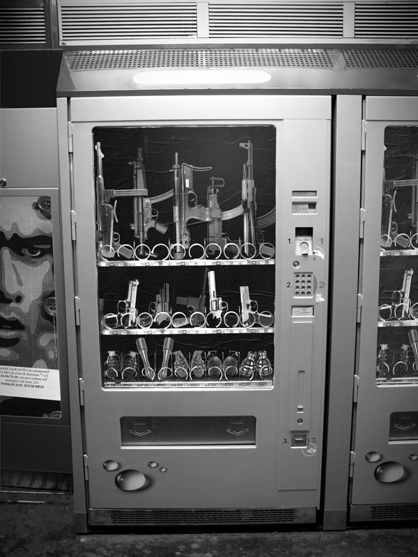 Dans nos sociétés contemporaines boulimiques et sur-consommatrices prolifèrent les distributeurs automatiques en tous genres. Les armes n’y trouveront-elles pas peu à peu leur place ramenées à la fonction de banals produits de consommation ? Peut-être un jour aux États-Unis où on observe 89 armes en circulation pour 100 habitants… un sujet on ne peut plus d’actualité.